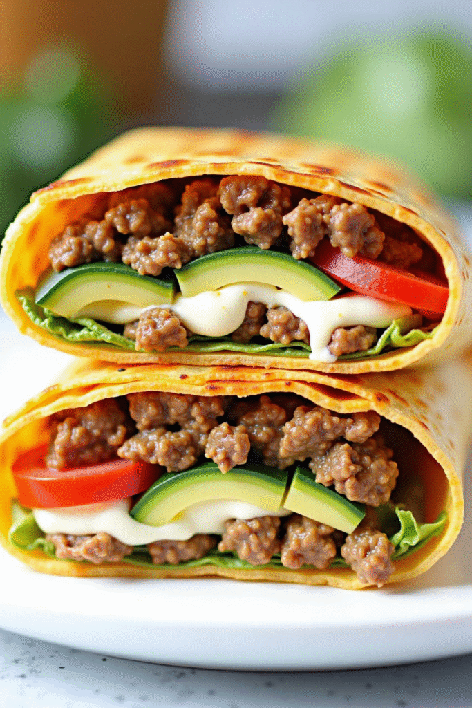 This recipe replaces the traditional flour tortilla with a sturdy, low-carb alternative, such as cheese wraps or homemade almond flour tortillas, achieving the familiar texture and crunch. Inside, layers of seasoned ground beef, creamy cheese sauce, and fresh vegetables create a bold combo of flavors and textures that’s as crave-worthy as takeout.