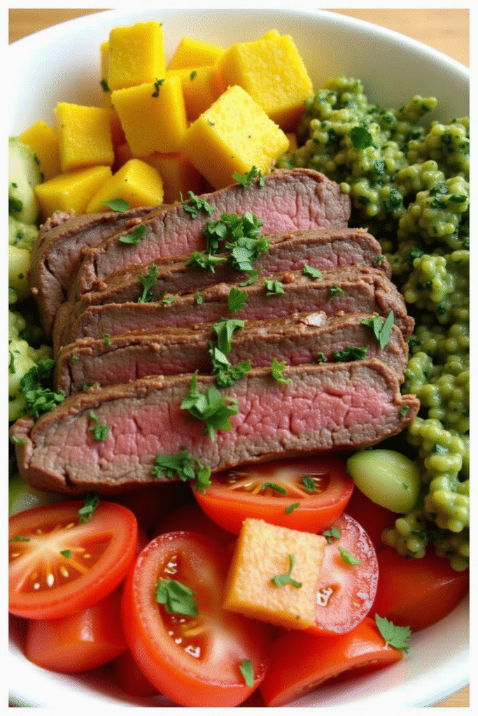 Build your bowl by layering freshly cooked quinoa or brown rice, arugula or baby spinach, then topping with warm steak slices, cherry tomatoes, sliced cucumber, Kalamata olives, and red onion. Add crumbled feta and a drizzle of the refreshing lemon-herb dressing just before serving. The mix of textures—tender steak, creamy feta, crisp vegetables—makes every bite delightful.