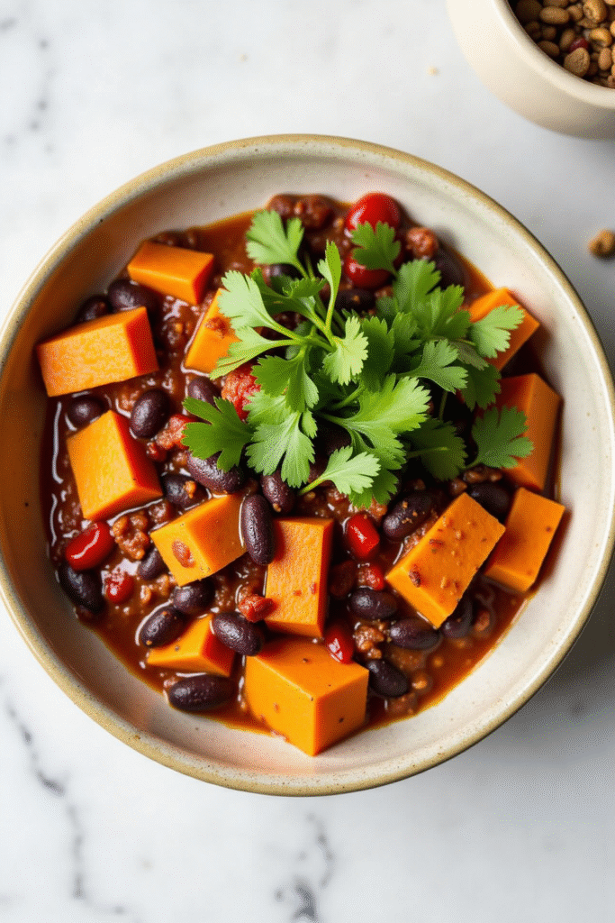 A protein-rich, plant-based chili with beans, tomatoes, bell peppers, and warming spices.